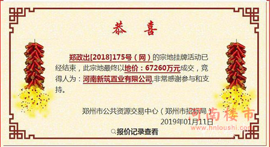 历经3小时竞价,正商以67260万元摘得!折合楼面价5235元/㎡,正商再次刷新高新区楼面价地王纪录(金辉5218元/㎡)!2019年郑州首个地王诞生!