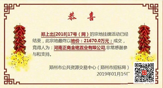 该地块位于上街区的通航五路东侧、安阳路北侧,土地性质为40年商业兼容商务,使用面积93643.23㎡,约合140.16亩。容积率<2.5,被正商集团以起始价21670万元摘得,折合154.61万元/亩。
