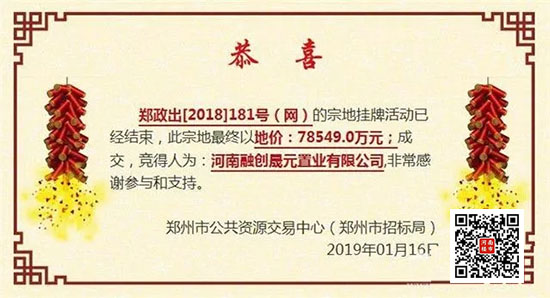 该地块位于中原区桐柏路西、黄水街南,使用面积69551.39㎡,约合104.33亩,土地性质为城镇住宅,兼容零售商业、餐饮、旅馆,容积率>1.0,<4.1,被河南融创晟元置业有限公司以起始价78549万元竞得,折合752.91万元/亩。