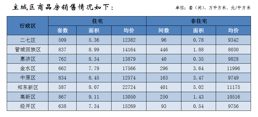 郑州全市商品房销售12489套(间),销售面积138.57万平方米,销售均价11548元/平方米;其中商品住宅销售10238套,销售面积116.4万平方米,销售均价11931元/平方米。非住宅销售2251套(间),非住宅销售面积22.17万平方米,非住宅销售均价为9536元/平方米。