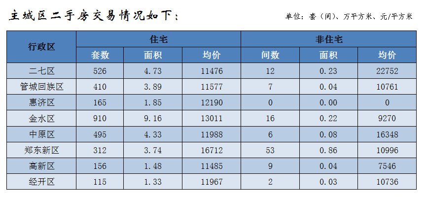 郑州全市二手房共成交4202套(间),成交面积43.44万平方米,成交均价10895元/平方米;其中住宅二手房共成交4052套,成交面积41.57万平方米,成交均价10871元/平方米。(备注:二手房均价是以评估指导价为计算依据)